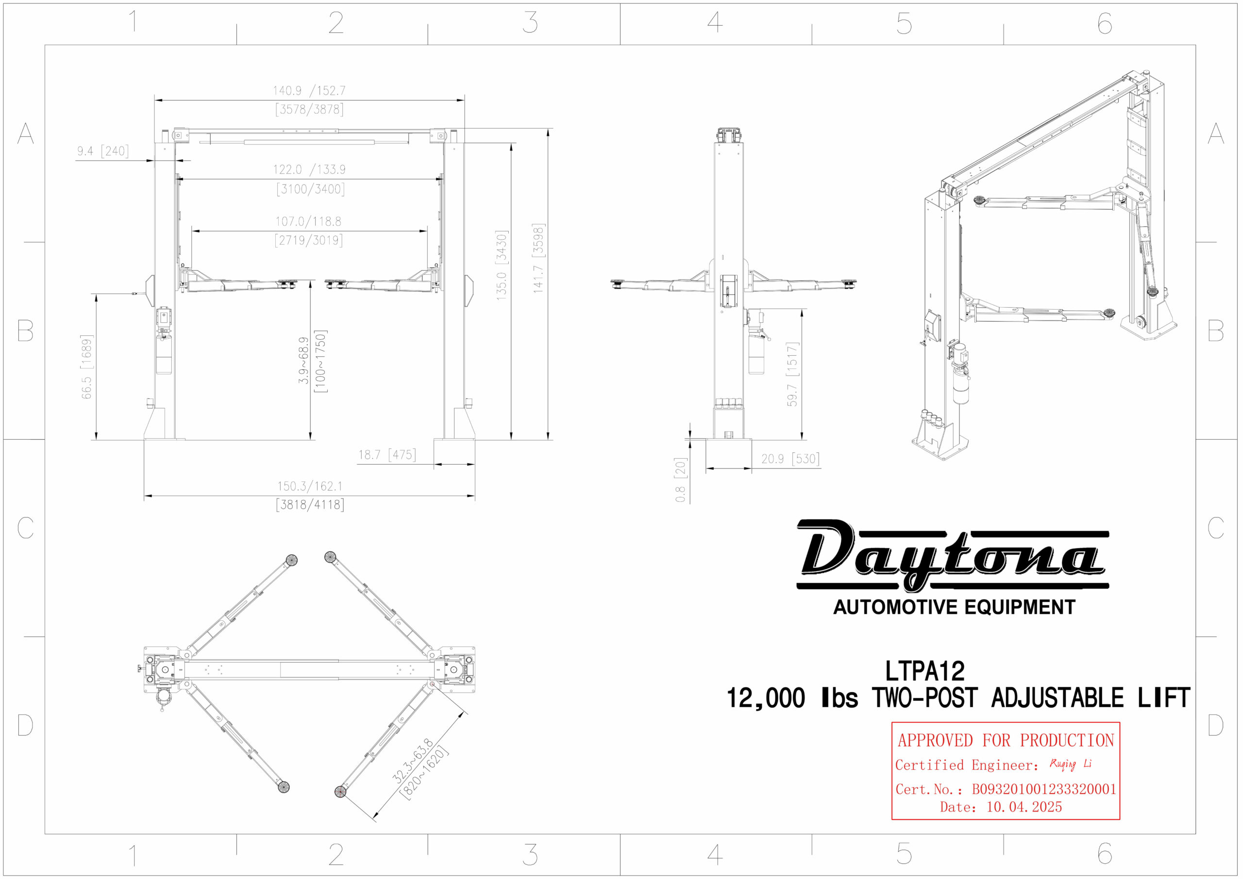 LTPA12 12,000lb 2-Post Adjustable Lift - Daytona Automotive Equipment