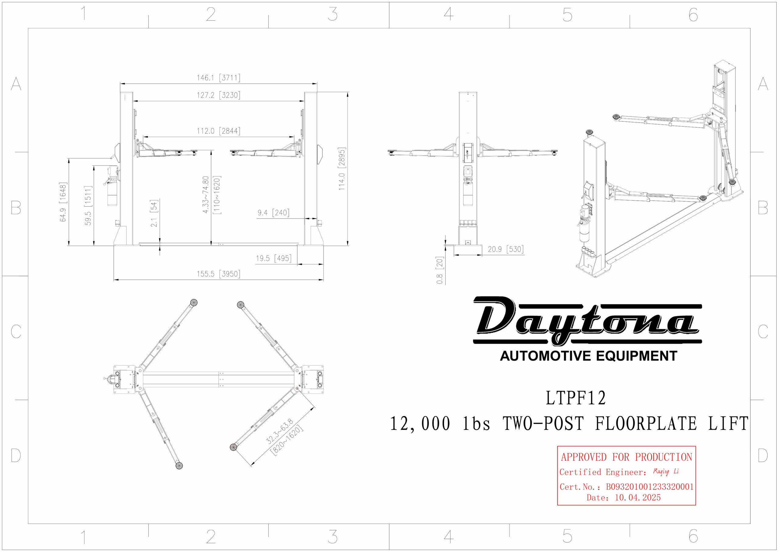 LTPF12 12,000lb 2-Post Floorplate Lift - Daytona Automotive Equipment